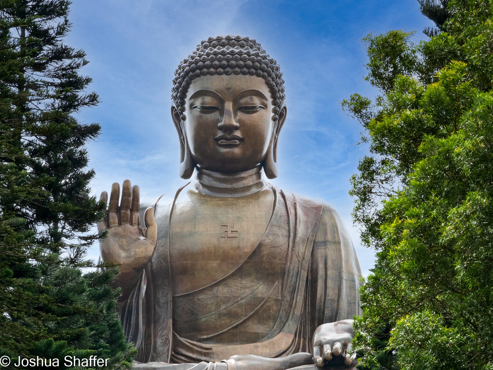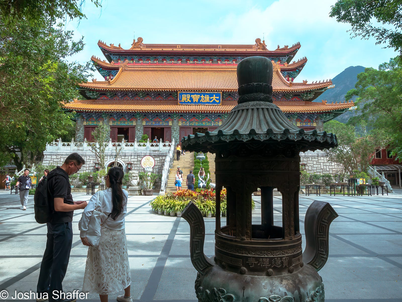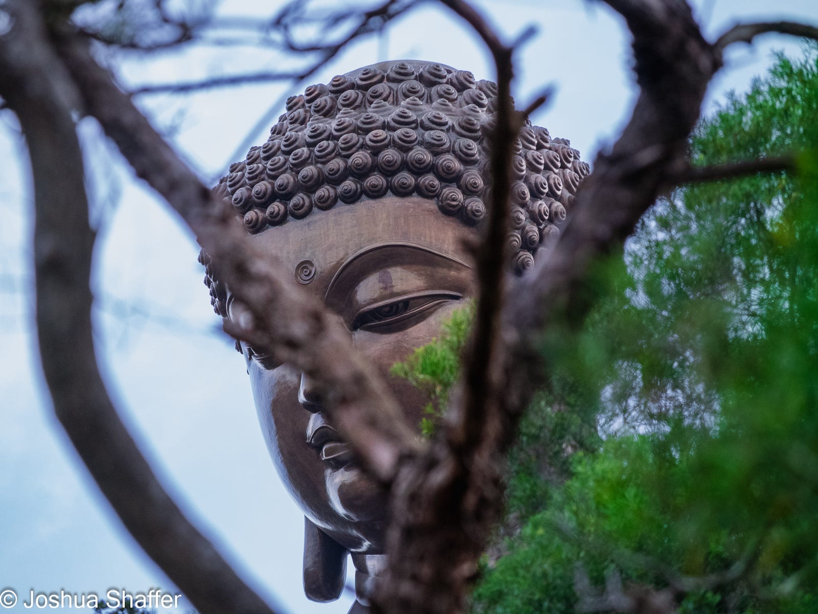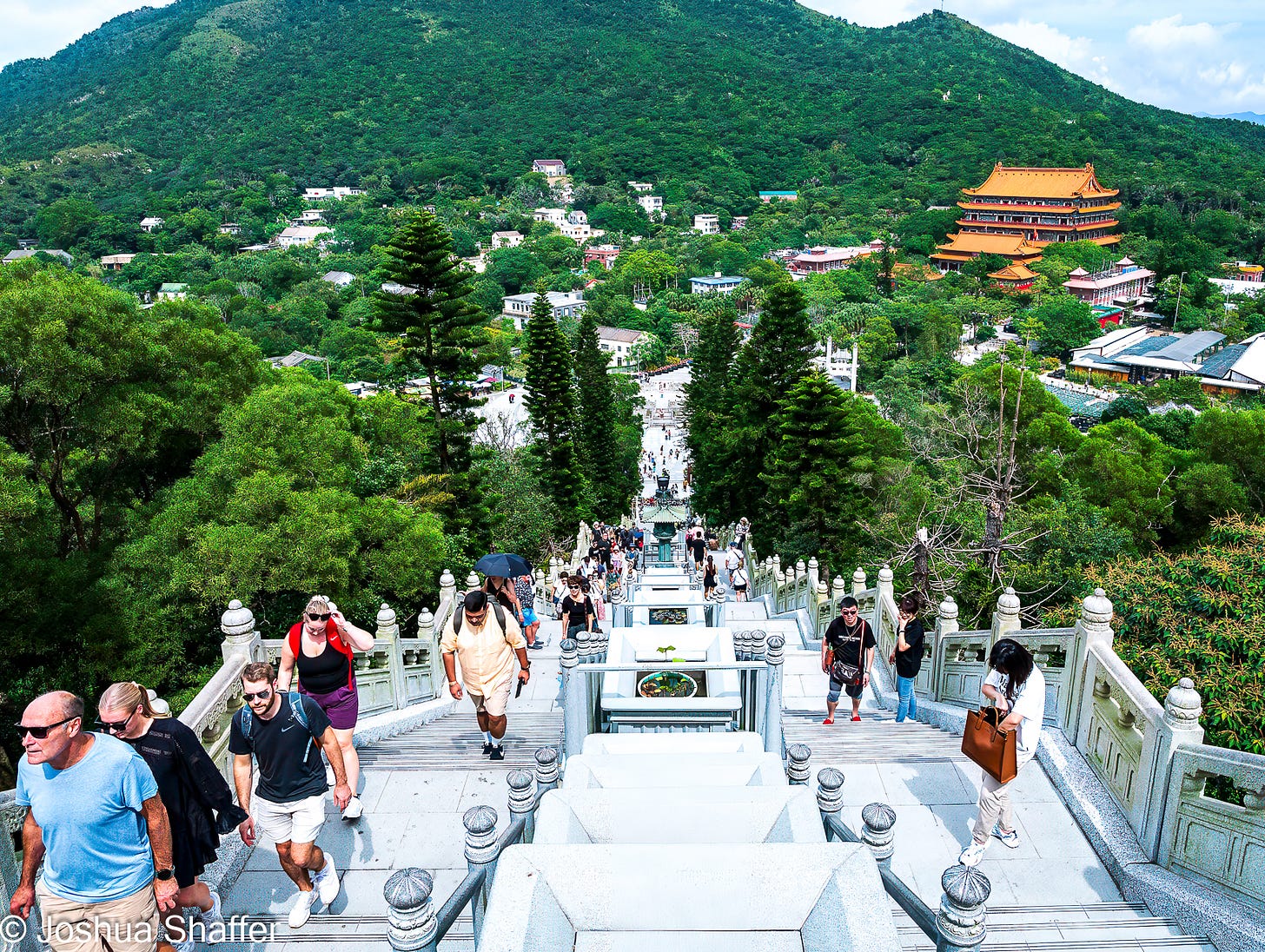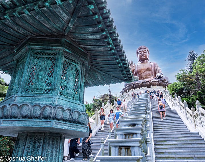 For over 30 years, the Big Buddha (officially the Tian Tan Buddha- but “Big Buddha” is too tempting not to say) has been considered the largest seated bronze Buddha in the world. A whopping 34 meters tall and 250 tons of bronze make up this formidable statue, but this copper creation doesn’t even crack the top ten biggest Buddhas in the world. The kaiju-sized Buddha market is incredibly competitive, it turns out1. We sweaty travelers climbed the 268 steps in midday heat to reach the Big Buddha base (say that 5 times fast), and once there, were treated to an impressive view of the ocean, densely forested peaks, and the Buddhist compound nestled far below.