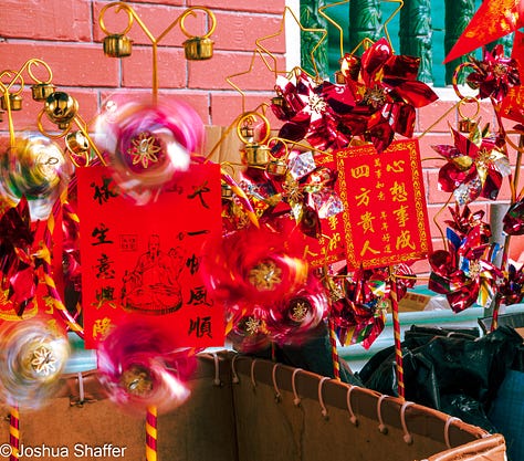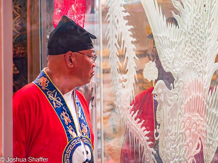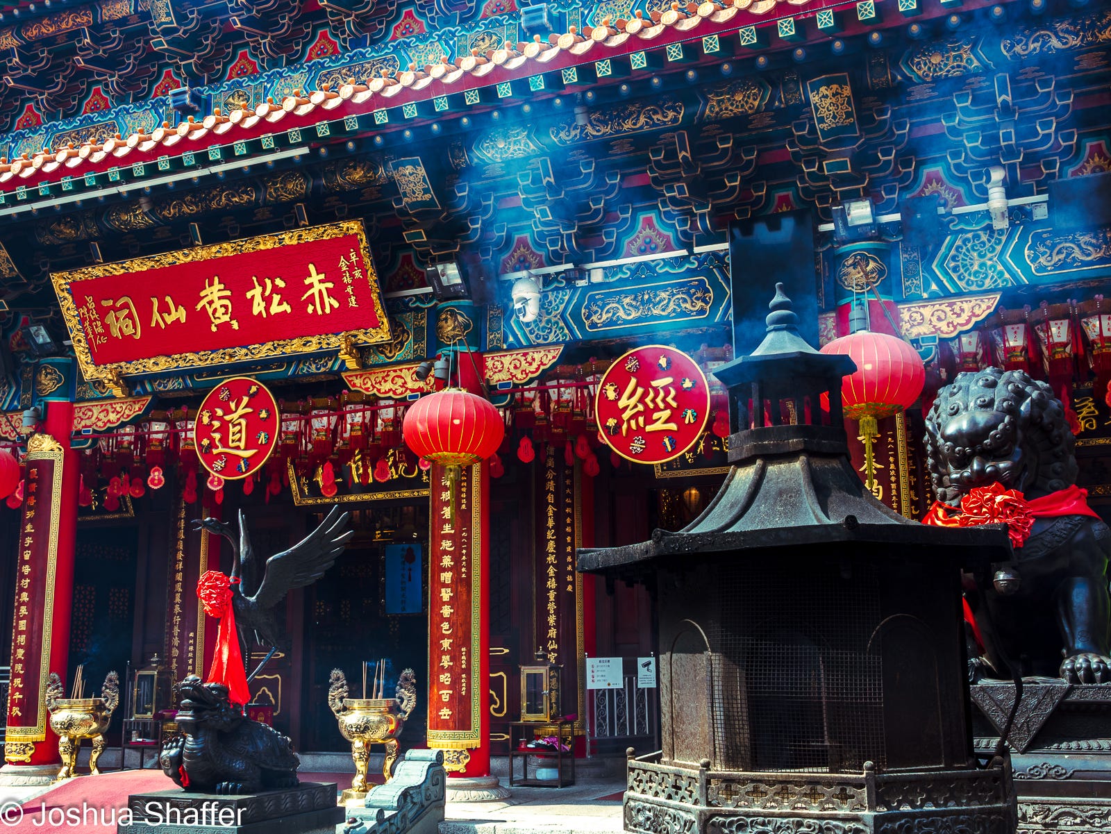 A bustling and vibrant temple, there is so much happening in any part of the packed grounds- sort of like a religious county fair: trinkets, oracles, and fortunes sold at the front, with bright flags, brilliant building façades, and mopey tourists throughout. Unlike most fairs, a thick layer of incense burning from dozens of braziers permeates and hangs in the air. A huge conglomeration of tourists inundated the venue. Some spectators, like I was, but most seemed to be on some level or other adherents to Daoism.