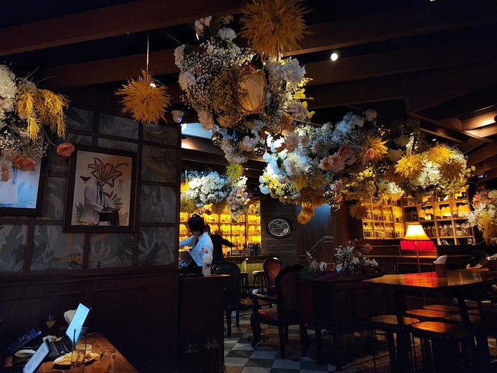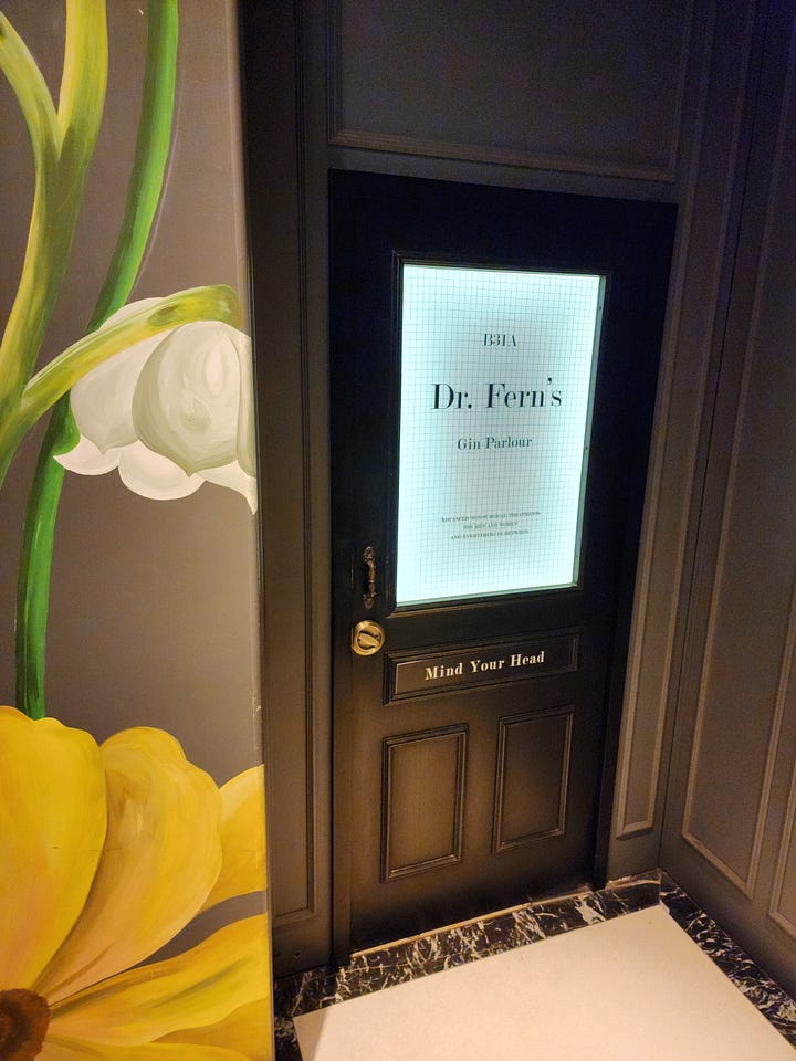 From the rooftop, we moved to the basement- and one of my favorite drinking spots in all of Hong Kong- a speakeasy called “Dr. Fern’s Gin Parlour” an old-timey inspired gin joint (and once voted “top 50 best bar in Asia”) that was fun, playful, and ridiculously hard to find. Like, walk around a giant closed-down mall’s labyrinthine basement into a hotel’s sub floors, only to come out through a parking garage before entering another sublevel and then finding the bar at a dead-end hallway level hard to find. But, most importantly, the place was worth it: the drinks were go**amned delicious12, and the mostly empty bar allowed us to relax and talk without having to shout, as opposed to most bars we’d been in. And we had faster table service, so Sunday night drinking for the win.