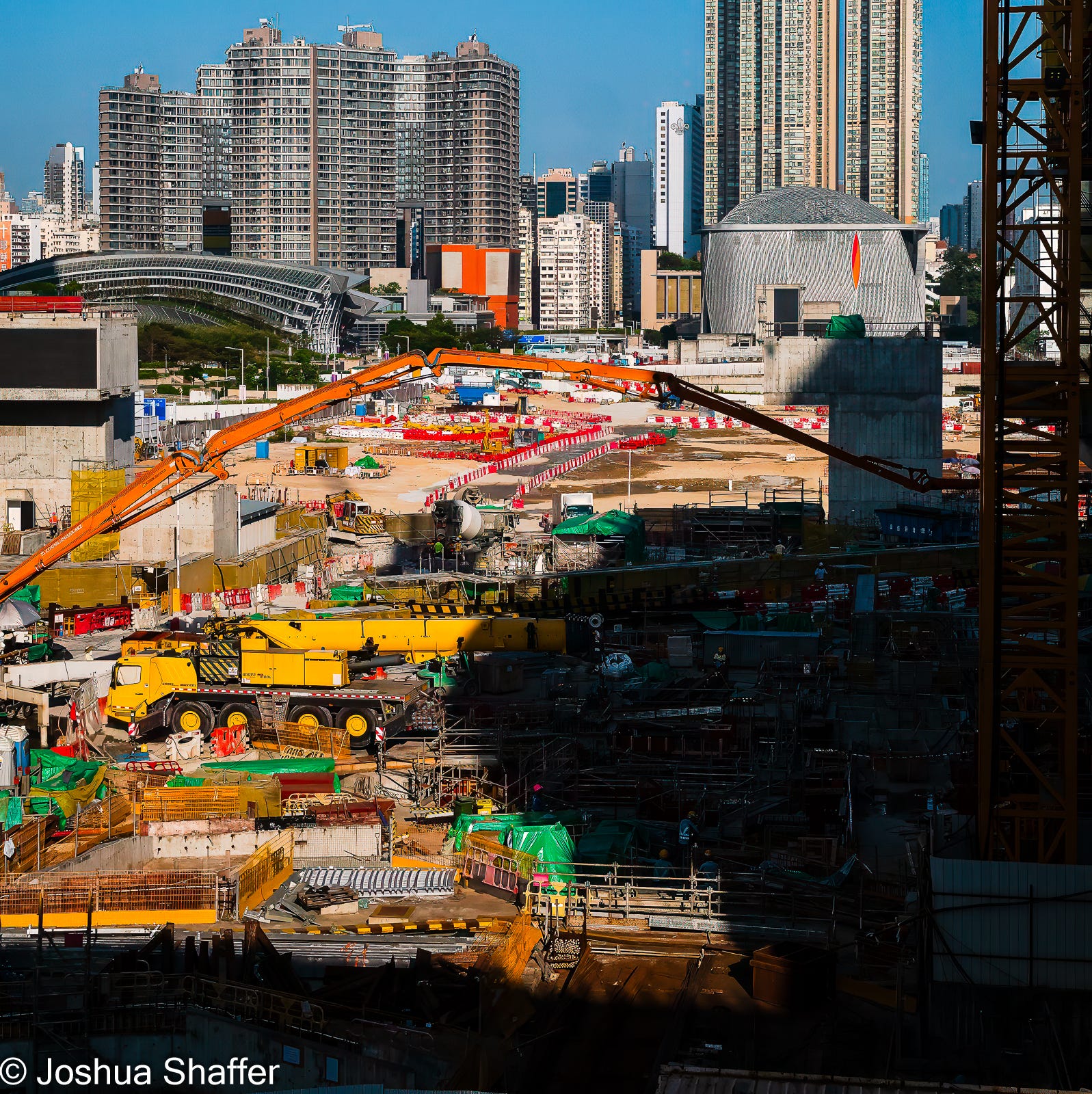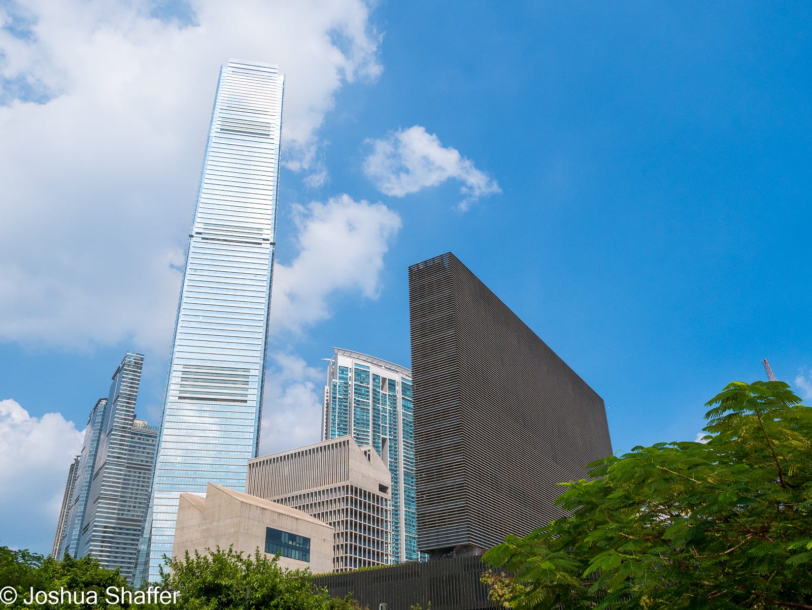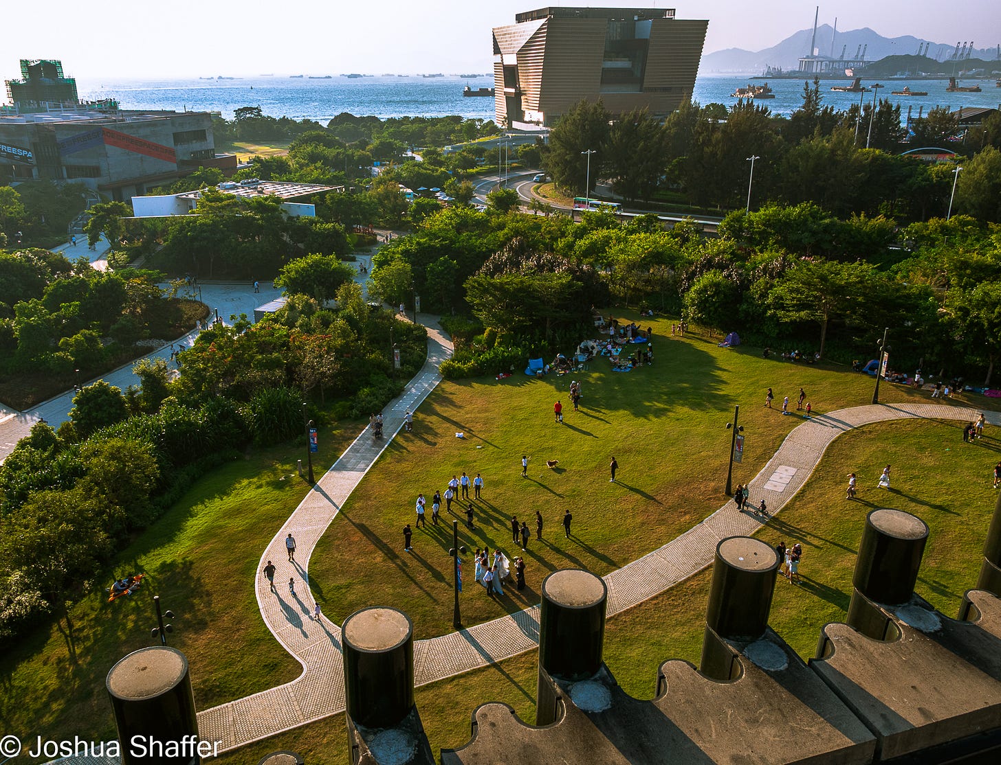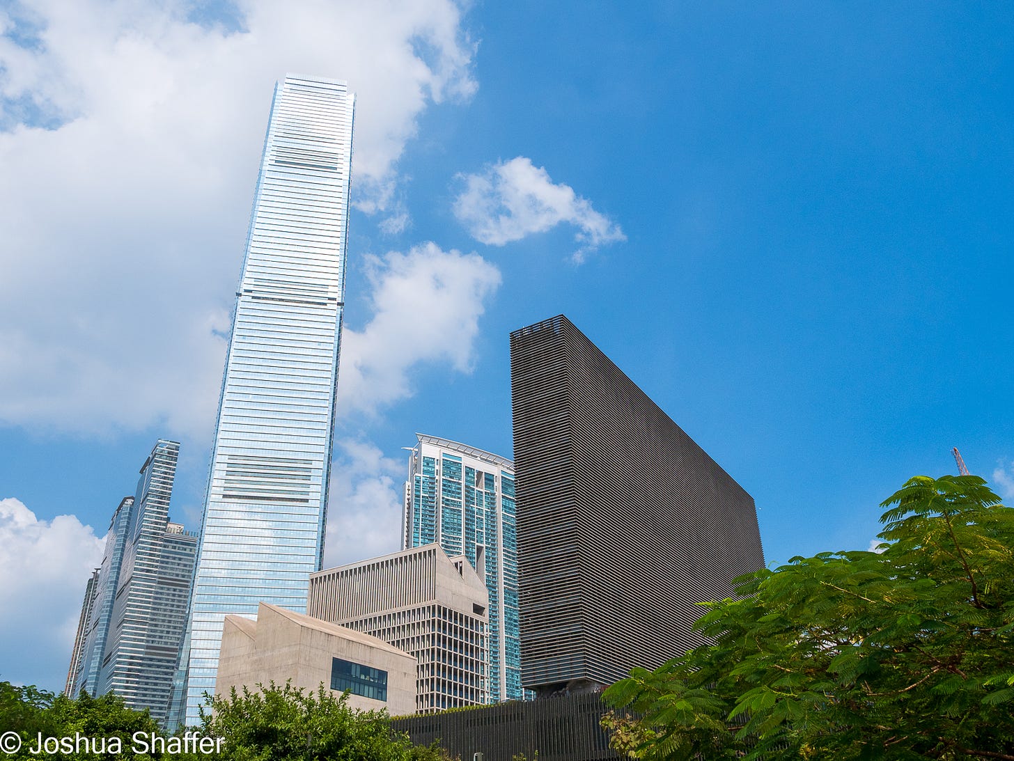 Opening only in 2021, the M+ used the preexisting tunnels of the airport train and reclaimed Victoria harbor space to create a massive 18-story structure that is both functional and aesthetically pleasing. The facade is comprised of almost half a million terracotta tiles. The building itself is sandwiched between the verdant green of a massive, new Kowloon park and the bay itself. This must be premium real estate, so it’s cool that the City regulators carved this space out for more abstract matters...