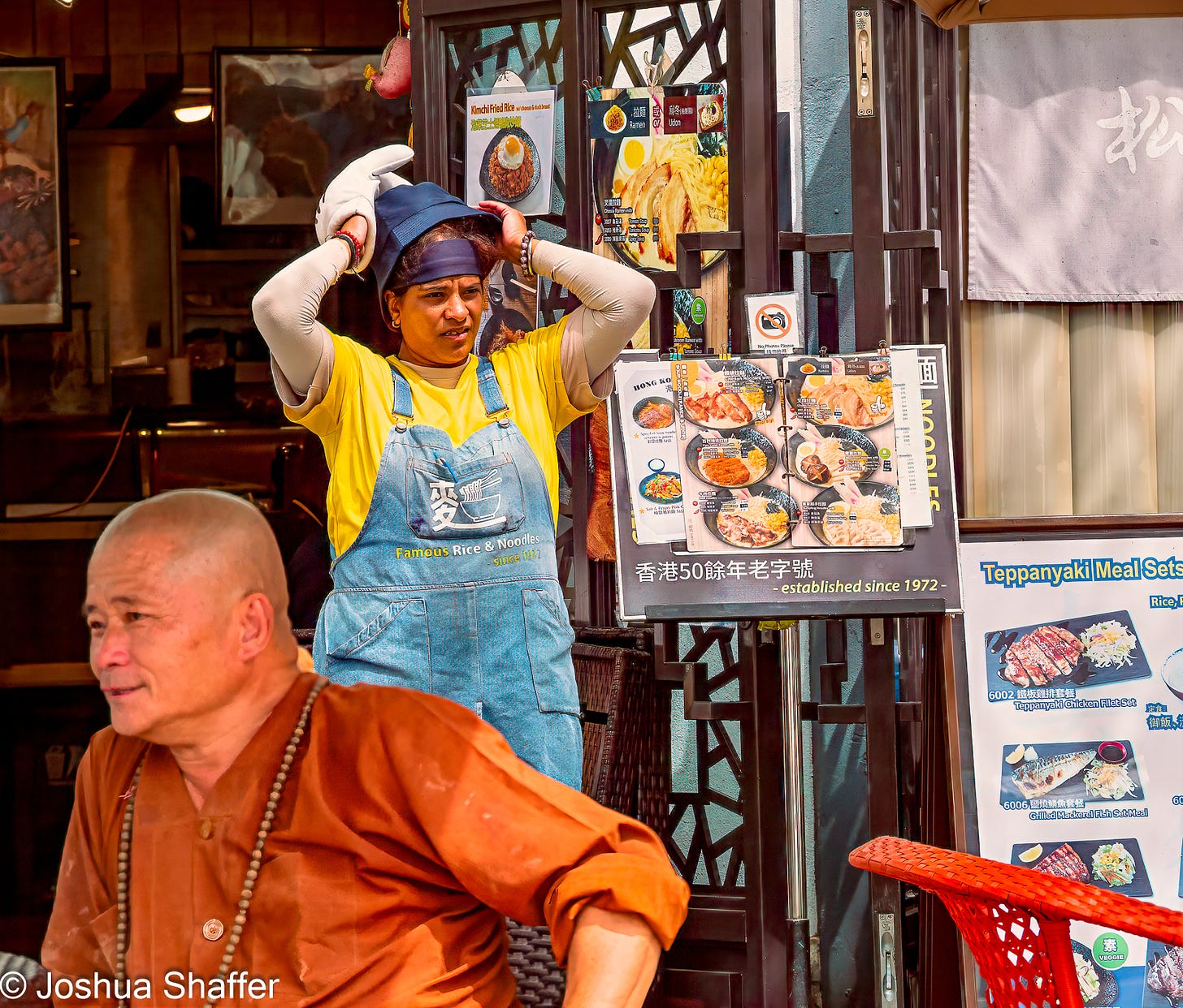 The monastery is almost 120 years old, the big-boy Buddha was built as a recent add-on to the complex of several shrines, halls, a hostel, and a nunnery2. Originally and charmingly named “The Big Hut” (大茅蓬), Po Lin’s main temple houses three bronze statues that represent the past, present, and future lives of Buddha. The main hall, almost suffocated in incense smoke and tapestries, is an explosion of color. After years of austere beige evangelical buildings, I really never get tired of the way so many colors make me feel.