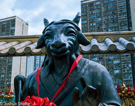 After seeing the peaceful side of Buddhist practice, it was time to visit a far more… commercially-minded religious institution: the Wong Tai Sin Temple. Wong Tai Sin is a Taoist temple, built by an herbalist who originally started the shrine in an apartment building that burned to the ground around the time of World War 1.